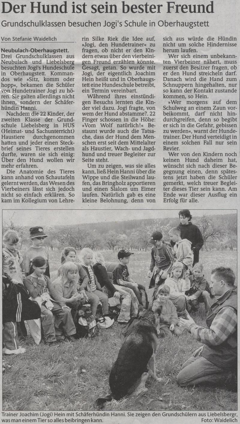 Die Anatomie des Tieres kann anhand von Schautafeln gelernt werden, das Wesen des Vierbeiners lässt sich jedoch nicht so einfach erklären. So kam im Kollegium von Lehrerin Silke Riek die Idee auf, >>Jogi, den Hundetrainer<< zu fragen, ob nicht er den Kindern etwas über den vierbeinigen Freund erzählen könnte. Gesagt, getan. So wurde mit Jogi, der eigentlich Joachim Hein heißt und in Oberhaugstett eine Hundeschule betreibt, ein Termin vereinbart.