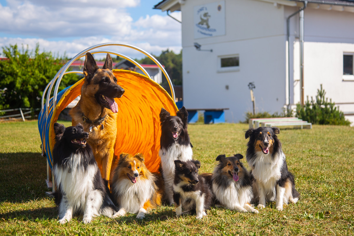 Soooo und das sind wir, Jogi & Uschi in unserem Seminarraum der Hundeschule und unser Hunderudel, das unsere Familie zu etwas ganz Besonderem macht!
